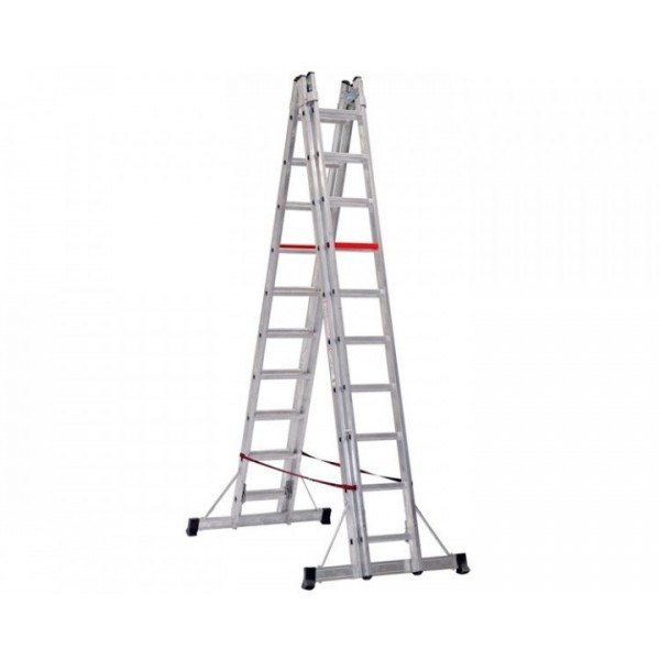 Може використовуватися як на рівній поверхні, так і на сходах. Телескопічне висування секцій забезпечує сходам стійкість навіть на різнорівневих поверхнях. Червоною сходинкою позначено граничний рівень підйому. Для більшої стійкості сходи забезпечені горизонтальними стабілізаторами. Забезпечено двосторонній підйом. Висота драбини - 4,79 м. Довжина секції - 2,98 м. Вага - 29,5 кг.
